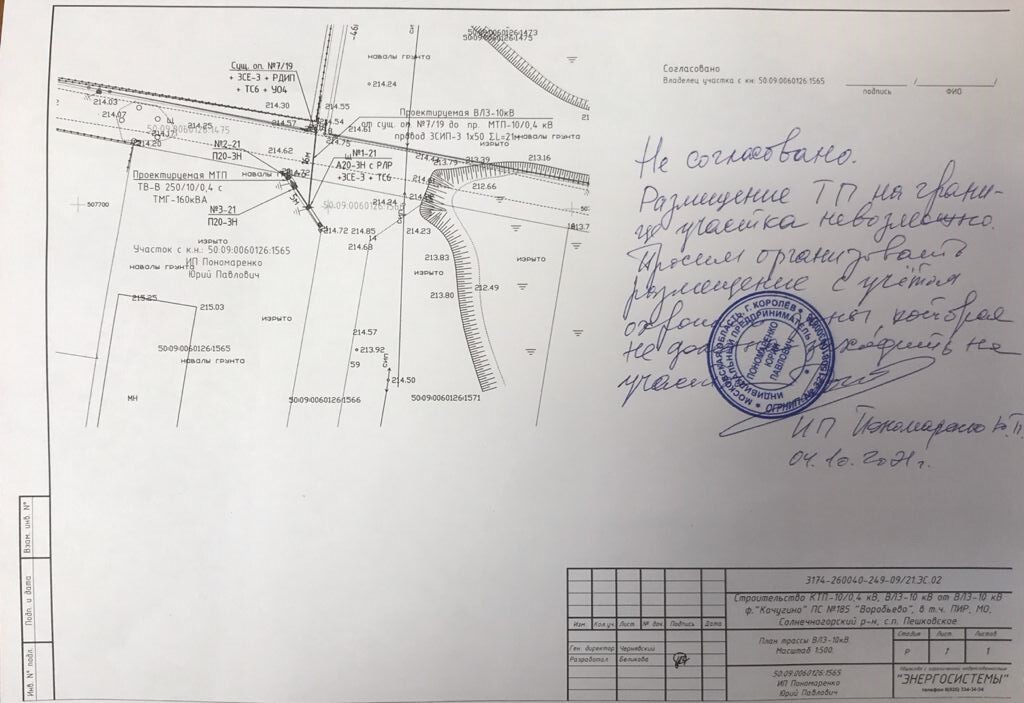 В ходе исполнения работ со стороны сетей, на согласование был представлен проект размещения КТП на границе участка заявителя. Мы рекомендовали не согласовывать такой проект, т.к. размещение высоковольтного оборудования накладывает обременение на участок и образуется охранная зона от места установки КТП (5 м, до зданий - 10 м), плюс заявитель обязан организовать круглогодичный подъезд районной службе к данной КТП. Все это значительно уменьшает площадь участка заявителя.